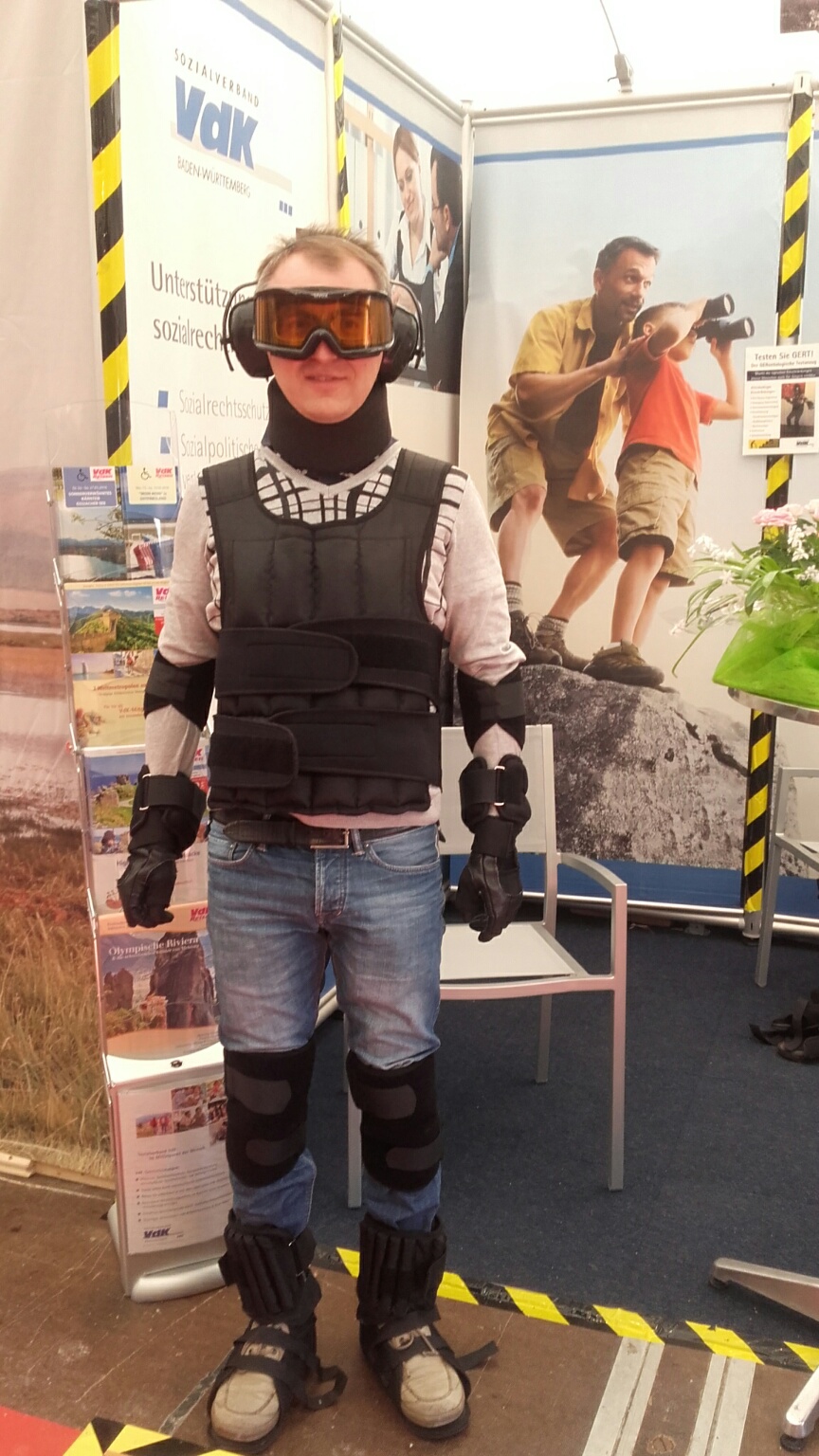 Auf der fdf - für die Familie in Tübingen am 04. März 2018 habe ich die Möglichkeit genutzt, am Stand des Sozialverbandes VdK den Alterssimulationsanzug anzuprobieren. Der Anzug wiegt ca. 25 kg, die Brille beschränkt das Sichtfeld und die Kopfhörer reduzieren das Hörvermögen. Damit bekommt man ein Gefühl dafür, wie sich ältere Menschen fühlen.